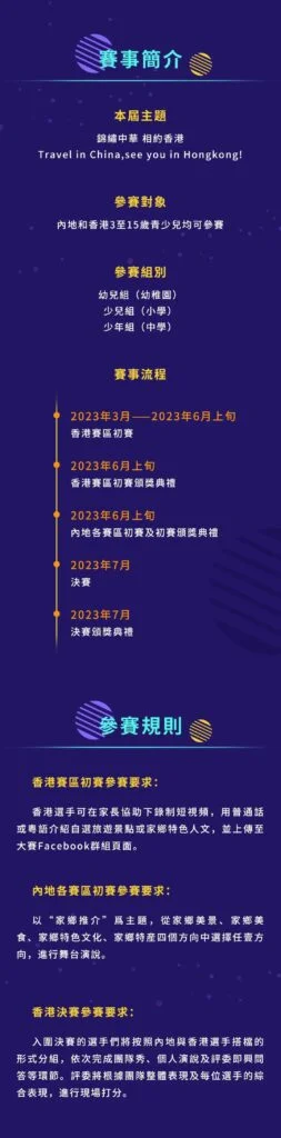 大賽以推動內地香港青少兒文化教育交流,促進內地及香港文旅產業復蘇,增進香港青少兒對祖國的了解,培養愛國主義思想,以及推廣普通話在港使用為主旨,以線上+線下賽程結合及比賽+研學結合為特色,匯聚了全國近50個城市,及數萬個家庭的參與。