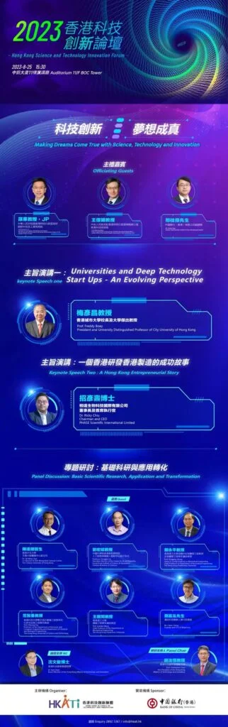 論壇將於2023年8月25日(五)下午3:30-5:30時假中銀大廈11樓演講廳舉辦,誠邀科研、科創者及科技從業者出席交流!