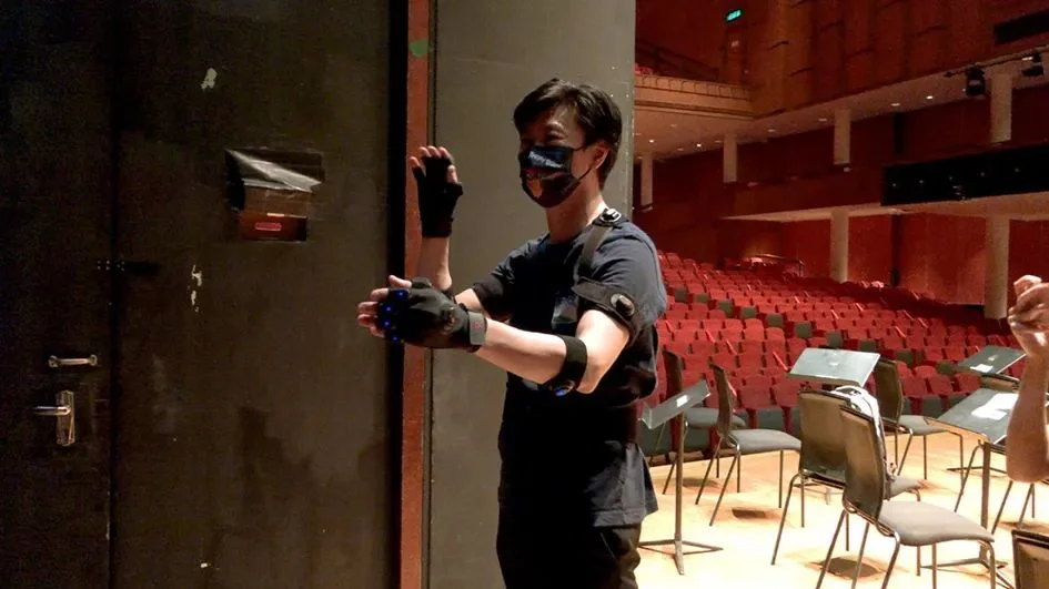 潘明倫戴上傳感器,在音樂會上同時指揮真人交響樂團和AI合唱團。圖:香港浸會大學提供
