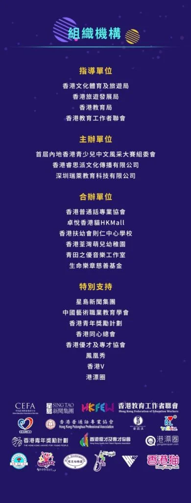 「錦繡中華 相約香港」首屆內地香港青少兒中文風采大賽由香港文化體育及旅遊局、香港旅遊發展局、香港教育局、香港教育工作者聯會等單位參與指導,由香港睿思派文化傳播有限公司及深圳瑞萊教育管理有限公司主辦,並獲得包括星島新聞集團、中國藝術職業教育學會、香港普通話專業協會、香港青年獎勵計劃、香港同心總會、香港優才及專才協會、鳳凰秀、香港V、港漂圈等單位的大力支持。