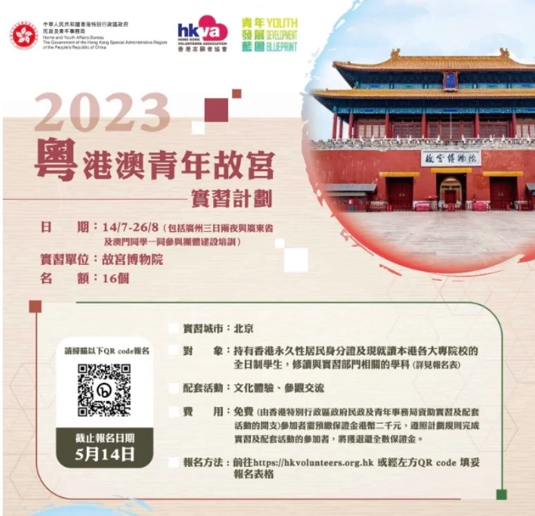 為增強本港青年對內地文化遺產保護工作及博物館事業的認識及促進文化交流,同時透過實習培養工作技能,積累工作經驗及拓寬視野進一步推動本地青年對世界文化遺產的認識,香港志願者協會將舉辦為期6星期的「粵港澳青年故宮實習計劃2023」,由即日起招募實習生,讓青年親往北京故宮博物院展開實習。