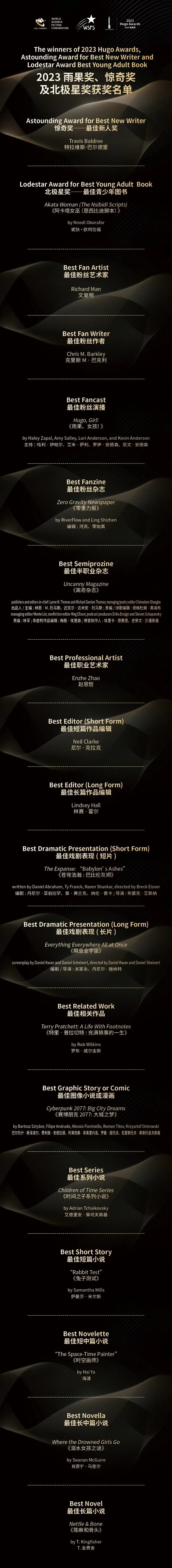 獲獎者中有不少來自歐美多國的科幻名家,同時也不乏來自韓國、尼日利亞、越南等非英語國家的作品(人員)入圍,充分體現了本屆雨果獎的權威性和世界性。